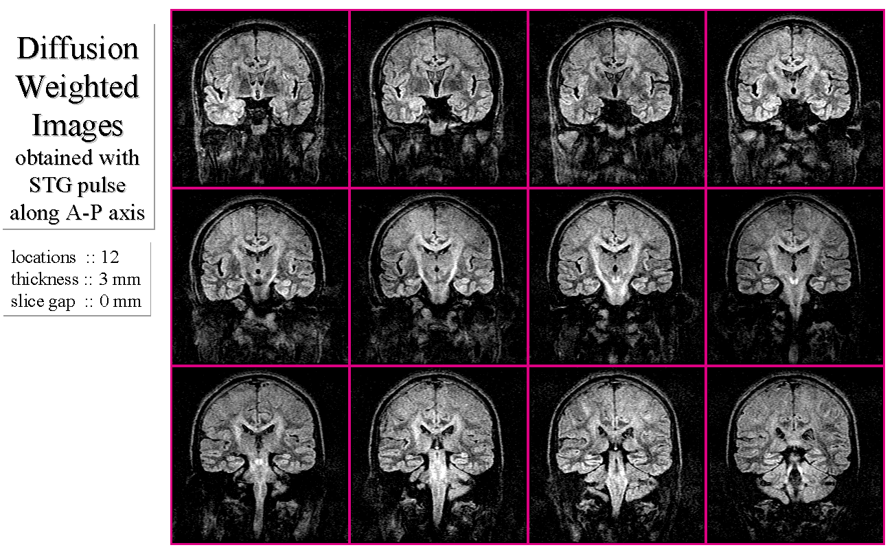 MRI装置の技術進歩は著しい。数年前まで高画質の取得が困難であると思われていた拡散強調撮像法は、EPIを可能とする装置によってモーションアーチファクトを最小限に抑えた画像の取得が可能となっている。また、撮像法として従来よりSEパルス系列にSTG(Stejskal-Tanner gradient)パルスを組み込んだ手法が一般的であったが、EPI装置の出現とともにSE-EPIパルス系列にSTGパルスを組み込んだ手法に移行しつつある。