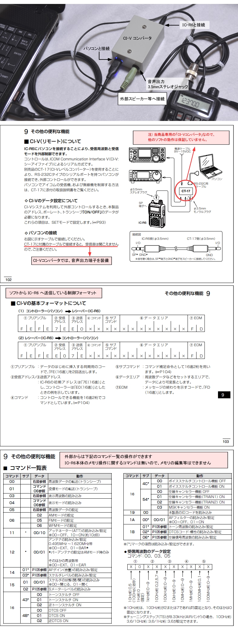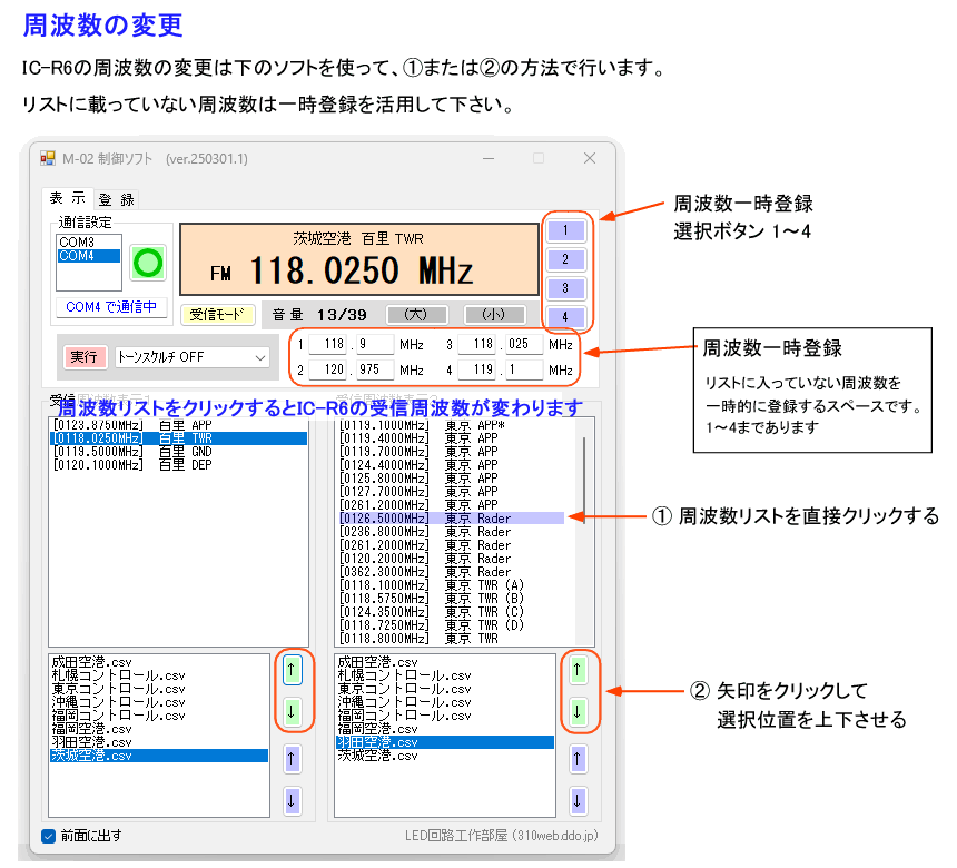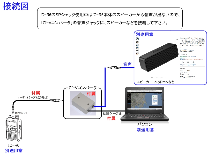 【ページ選択】 ・商品の説明 ・IC-R6との接続に関する取扱説明 ・ソフトの取扱説明 (M-02 制御ソフト(A)) ・ソフトの取扱説明 (M-02 制御ソフト(B)) ・ソフトのダウンロード ・質問(Q&A) 商品の説明 icom IC-R6 を自宅で使用していて、受信したい周波数を本体のダイヤルを回して探すのは大変じゃないでしょうか? この商品は、パソコンから icom IC-R6 の 受信周波数 や 音量 を簡単に変えることができるセットです。 受信周波数 や 音量 の変更は、制御ソフト※2 から クリック で操作できます。 セット内容は、IC-R6 と パソコン を接続するための CI-V コンバータ、ケーブル(2種類) および パソコンで使用する 制御ソフト です。 制御ソフト は表示サイズの異なる (A) と (B) があります。 受信したい周波数は 制御ソフト からの 登録※3 または、データファイルをメモ帳で開き直接記述して登録して下さい。登録数は無制限です。 ソフトのダウンロードは自由なので、購入前にお使いのパソコンでソフトが起動するか確認をおすすめします。 ※1 OS は Windows 11、Windows 10、Windows 8、Windows 7、Windows Vista に対応 ※2 この商品は、クローニング (IC-R6本体のメモリを編集する) 機能はありません ※3 サンプルで周波数データを登録してありますが、周波数が間違っていましたら修正して下さい。 ( 登録データ : 東京・札幌・福岡・沖縄コントロール、羽田空港、成田空港、福岡空港、茨城空港 ) この商品を使用中は IC-R6 本体から音声が出ませんので、CI-V コンバータの音声出力 (3.5mmステレオジャック) に スピーカーなど (Amazonで2000円程度で買えます) を接続して音声を出して下さい。 ![]() ![]() セット内容 @〜Cのセットです。 @〜B はクリックポストで発送ます。 Cはダウンロードして下さい。 @ CI-V コンバータ ( CI-Vコンバータ経由で IC-R6 と パソコン を接続(通信)します。 IC-R6の音声を出力するジャックが付いています。) A USBケーブル (1m) ( パソコン と CI-Vコンバータ を接続するケーブル ) B オーディオケーブル (1m) ( IC-R6 と CI-Vコンバータ を接続するケーブル ) C ソフト ( 商品ホームページ からダウンロードして下さい。 ) ![]() 使い方 下図のように接続して使用します。 ![]() 使用時の設置例 管理人は卓上で下の写真のように設置して使用しています。 ![]() この商品の動画 (YouTube) ・商品の使い方 https://youtu.be/fgI7K4vpwXI ・商品を使用中 https://youtu.be/rUHsxjl01yo CI-V リモート と CI-V コンバータ について この商品は 「IC-R6 取扱説明書」 102ページに記載の "CI-V (リモート)" の機能を使い、外部(パソコン)から周波数を変更する指定の制御フォーマット (103ページ記載) を IC-R6 に送信して 周波数の変更を行っています。 IC-R6 と パソコン を接続するために、純正品では「CT-17」を使用していますが、 ここで紹介している商品は パソコンと IC-R6 を USB 接続 で 通信 ができるように 自主製作 (管理人の手作りです) した「CI-V コンバータ」 を使用します。 また「CT-17」は音声出力用の端子がありませんが(たぶん)、「CI-V コンバータ」では音声出力ができるように "3.5mm ステレオジャック" を搭載しています。 外部からはコマンド一覧 (104ページ記載) の 各動作に対応した コマンド を使用し IC-R6 の操作を行います。 ただし、本体メモリの編集などコマンド一覧に載っていない操作 (IC-R6 本体のメモリ編集などは不可) はできません。 【 注意! 】 「CI-V コンバータ」は付属ソフト以外の動作は保証していません ![]() |