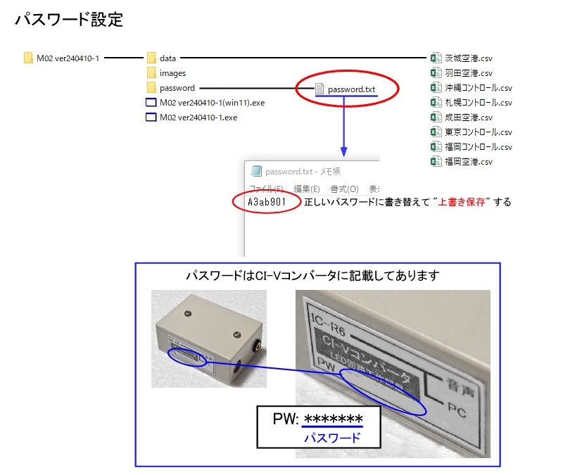 【ページ選択】 ・商品の説明 ・IC-R6との接続に関する取扱説明 ・ソフトの取扱説明 (M-02 制御ソフト(A)) ・ソフトの取扱説明 (M-02 制御ソフト(B)) ・ソフトのダウンロード ・質問(Q&A) ソフトのダウンロード 【 注意事項 】 @ ソフトはデータを保存するファイルの拡張子が異なる .csv または .txt バージョンがあります。メモ帳で受信周波数を編集する場合は TXTバージョンの方が扱いやすいです。 好きな方をご使用下さい。 A 制御ソフトは(A)と(B)があります。好きな方をご使用下さい。 B このソフトは初回のみパスワードを設定しないと、IC-R6との通信ができません。 下図の"password.txt" をメモ帳等で開き、「CI-Vコンバータ」の側面に記載してあるパスワードを半角で記述して "上書き保存" して下さい。 C 対応OSは Windows11、Windows10、 Windows8、 Windows7、 Windows Vista です。 Windows11、Windows10 は、ダウンロードしたファイル中の "(win11)" と書いてある .exeファイル を起動してください。 D ソフト起動時に「.NET Framework 2.0, .NET Framework 3.0」が必要な場合はOSの指示に従いインストールして下さい。 または、「Windows11、10で「.NET Framework 3.5」エラーが出る場合の対応」を参考にして下さい。 ![]() 【 2025.11.20 更新 】※ 使用するパソコンが異なっても、[data] フォルダ内の登録データファイルを移しかえれば、データをそのまま使用できます。 ○ 「M-02 制御ソフト(A)(B) ver250301 CSVバージョン」のダウンロード ここをクリックしてダウンロード [M02_250301csv.zip 112kB] ○ 「M-02 制御ソフト(A)(B) ver250301 TXTバージョン」のダウンロード ここをクリックしてダウンロード [M02_250301txt.zip 112kB] ![]() |