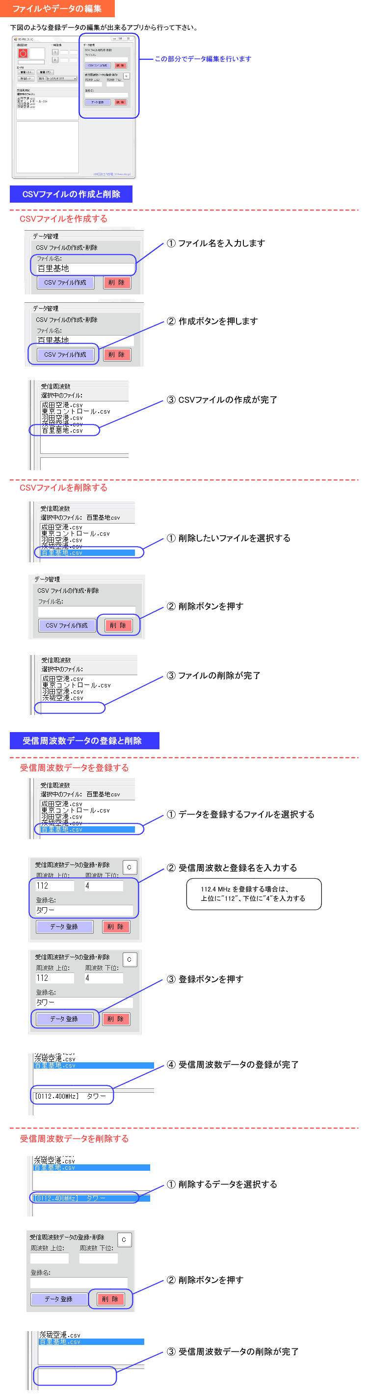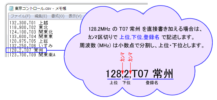 【ページ選択】 ・商品の説明 ・IC-R6との接続に関する取扱説明 ・ソフトの取扱説明 (M-02 制御ソフト(A)) ・ソフトの取扱説明 (M-02 制御ソフト(B)) ・ソフトのダウンロード ・質問(Q&A) ソフトの取扱説明 (M-02 制御ソフト(A)) 1. ソフトの起動 および 通信の開始 2. 標準ソフトの取扱説明 2(1). ソフトの各部説明 2(2). 受信周波数を変更する方法 2(3). 受信周波数データの登録方法 2(3)-1. ソフトから登録する 2(3)-2. 直接ファイルへ登録する 2(4). その他の操作 1. ソフトの起動 および 通信の開始 ソフトは ダウンロード ページからダウンロードして下さい。 (1) ソフトの起動 下図の ソフト本体の 〜.exe をクリックするとソフトが起動します。 パソコンのOSが Windows10、11 の場合は、ソフト名が 〜(win11).exe を使用して下さい。 ![]() (2) IC-R6 とパソコン の通信を開始します ※下図参照 通信を開始するとソフトからIC-R6の受信周波数を変更できるようになります。 ![]() 2. ソフトの取扱説明 2(1). ソフトの各部説明 ![]() 2(2). 受信周波数を変更する方法 受信周波数の変更は、受信周波数一覧の登録データをクリック または 一時登録 からできます。 受信周波数の変更は、一部はキー操作でできます。 ![]() 2(3). 受信周波数データの登録方法 受信周波数データは 成田空港 や 東京コントロール など、区分ごとに管理できるようになっています。 データの登録は、ソフトから登録する または 直接ファイルへ登録する で行って下さい。 2(3)-1.ソフトから登録する 下図のソフトのバージョンが異なりますが、登録方法は同じです。 ![]() 2(3)-2.直接ファイルへ登録する ソフトのファイルは下図の構造になっているので、 dataフォルダ の 該当するファイルを開き直接編集して下さい。こちらの方が登録が速いです。 ![]() 登録データはデータファイルをメモ帳などで開き、下図の要領で直接記述、編集して下さい。 ![]() 2(4). その他の操作 ![]() |