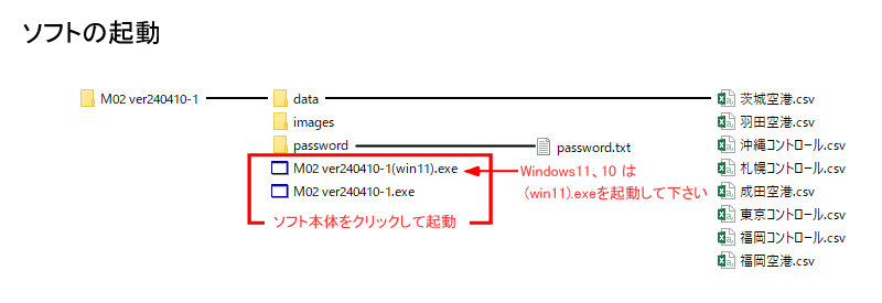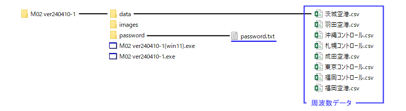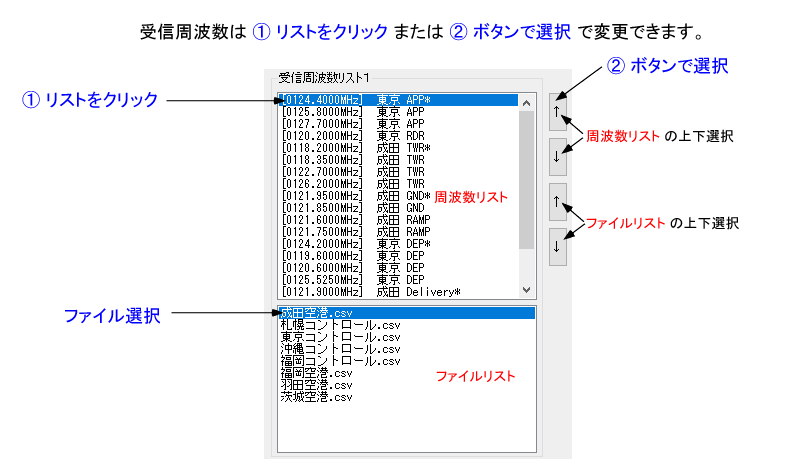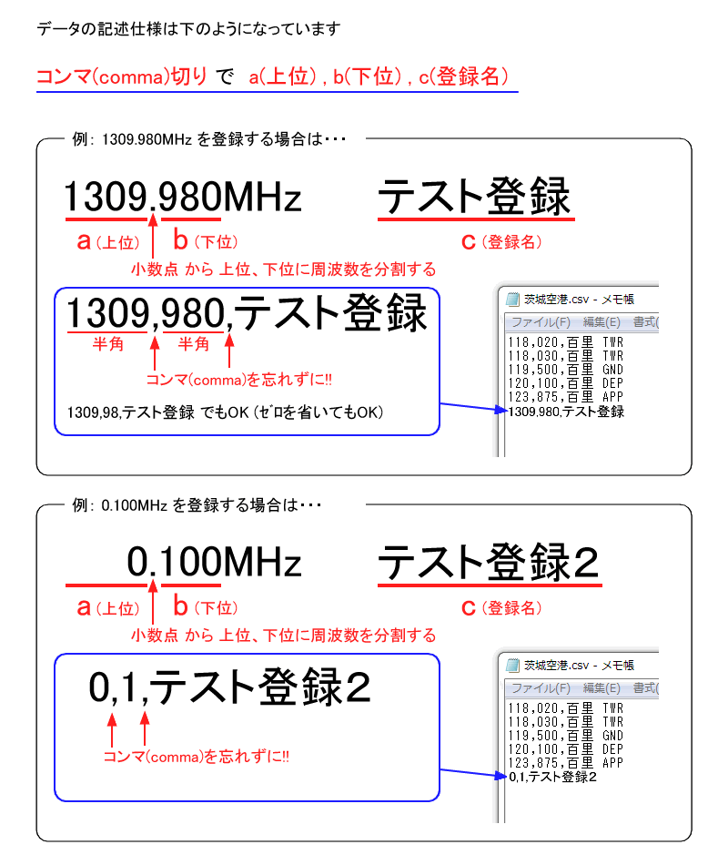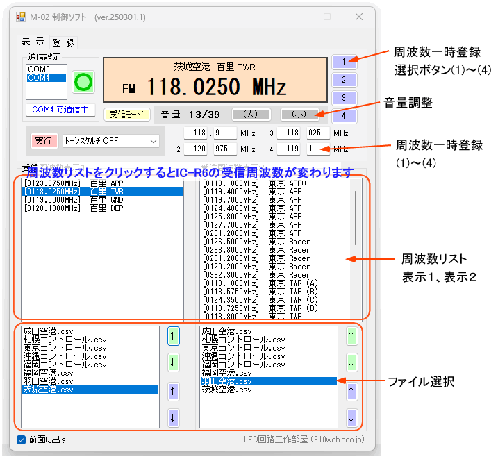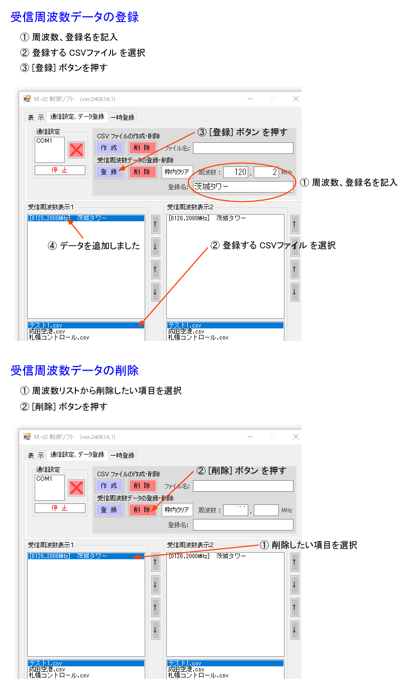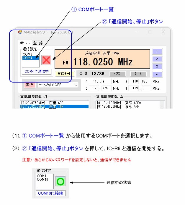 【ページ選択】 ・商品の説明 ・IC-R6との接続に関する取扱説明 ・ソフトの取扱説明 (M-02 制御ソフト(A)) ・ソフトの取扱説明 (M-02 制御ソフト(B)) ・ソフトのダウンロード ・質問(Q&A) ソフトの取扱説明 (M-02 制御ソフト(B)) ソフトの概要 このソフトは表示サイズが大きいですが、周波数リストを2つ並列表示できます。 ![]() 1.パスワードの設定 および ソフトの起動 パスワードの設定 このソフトは初回のみパスワードを設定しないと、IC-Rとの通信ができません。 下図の"password.txt" をメモ帳等で開き、「CI-Vコンバータ」の側面に記載してあるパスワードを半角で記述して "上書き保存" して下さい。 ![]() ソフトの起動 下図の ソフト本体の 〜.exe をクリックするとソフトが起動します。 パソコンのOSが Windows10、11 の場合は、ソフト名が 〜(win11).exe を使用して下さい。 ![]() 2.通信の開始 通信の開始は「表示」タブをクリックして下さい。 下図の手順に従い、通信を開始します。通信開始後はソフトからIC-R6の受信周波数の変更が可能になります。 "パスワードが違います" のエラーが出る場合、パスワードの設定を行って下さい。 ![]() 3.受信周波数の変更 IC-R6の周波数は周波数リストをクリックすると変わります。 また、ボタン選択でも変更できます。 ![]() 4.受信周波数の登録、削除 受信周波数の登録や削除は「直接ファイルを開き登録、削除する」または「ソフトから登録、削除する」の2通りあります。 「直接ファイルを開き登録、削除する」の方がおすすめです。 (1) 直接ファイルを開き登録、削除する ・CSVファイルを作成、削除 "dataフォルダ" 内に周波数データのファイルがあります。既存のファイルをコピー、またはソフトでCSVファイルを作成して下さい。 ・周波数データの登録、削除 "dataフォルダ" 内に周波数データのファイルがあるので、そのファイルをメモ帳等で開き、下図の記述で登録します。 ![]() ![]() (2) ソフトから登録、削除する ソフトの「通信設定、データ登録」タブをクリックすると、CSVファイルの作成、削除、周波数データの登録、削除画面になります。 ・CSVファイルを作成、削除 CSVファイルの作成は、ファイル名を記入して [作成]ボタン を押す。 CSVファイルの削除は、削除するファイルを選択して [削除]ボタン を押す。 ・周波数データの登録、削除 周波数データの登録は、周波数、登録名を記入して [登録]ボタン を押す。 周波数データの削除は、周波数リストから削除したい項目を選択して [削除]ボタン を押す。 ![]() ![]() 5.一時登録 周波数データを登録していない周波数を受信したい場合は一時登録を使用します。 周波数の設定枠(1)〜(4)へ受信したい周波数を記入します。 周波数の選択ボタン[ 1 ][ 2 ][ 3 ][ 4 ]のボタンを押すとIC-R6の周波数が変わります。 ![]() |